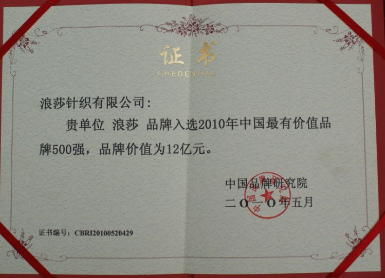 “浪莎”品牌入選2010年中國最有極致品牌500強